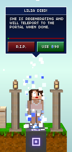 After death, a blockhead will start regenerating. When a blockhead is regenerating, it will show the blockhead spinning with its head slightly tilted upwards at the location it died while a portal-like music plays when the display is scrolled near it. Items in the inventory can still be dropped manually. A blockhead can be permanently killed at this point by tapping the "R.I.P." button, and if chosen, all items will be dropped. Otherwise, the player can wait about 10 minutes for the blockhead to regenerate completely and teleport to that world's original spawn portal. The wait can be rushed for up to 100 time crystals as well.