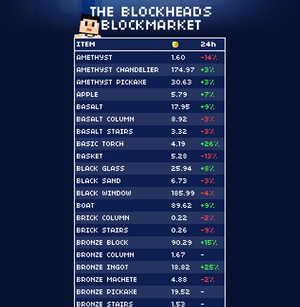 The Blockmarket website was opened to the public on 11 August 2014. The defunct website, located at http://blockmarket.theblockheads.net, rebuilt at https://wiki.floofyplasma.com/Blockmarket, shows the current global prices to buy an item in gold coins at trade portals. It also shows the percent change since 24 hours ago, being red if the price has gone down and green if the price has gone up. Clicking on an item's name shows a graph of the price for the last 24 hours.